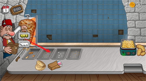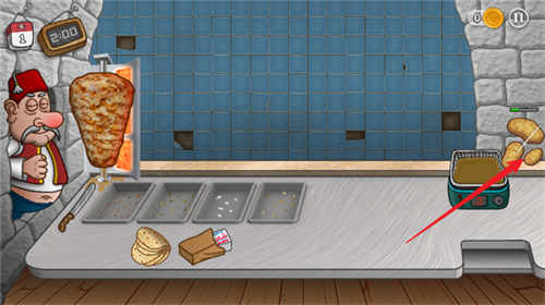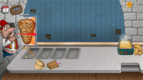3、由于炸薯条需要一定时间,玩家此时通过按住小刀在烤肉架上划动可以完成切肉的操作;