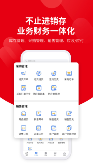 3、全功能移动办公套件,完整支持销售开单、库存调拨、客户对账等12种常见业务场景的移动化处理。