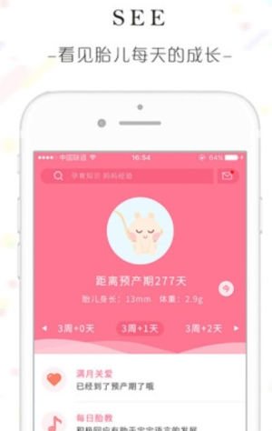 1、健康数据记录。每日登录填写身体状况,查看胎儿发育模拟图。异常症状可标记重点,方便就医时咨询。