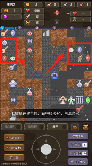 2、接着操控角色移动至地图中拿取金钥匙、银钥匙、铜钥匙、药水、宝石等道具,遇到敌人时发起攻击并将其击杀。