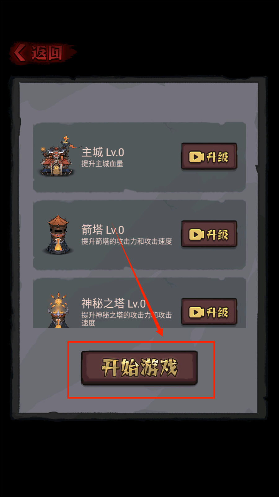 1、进入游戏界面后,可以选择开始游戏,在游戏开始后可以先给建筑单位升级,使它们在同一级内更加强大。