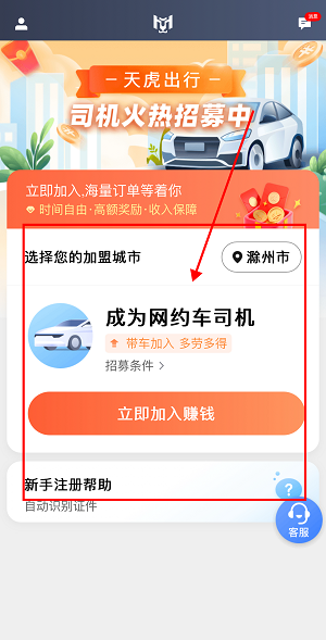 1、打开天虎出行app,点击“立即加入赚钱”。