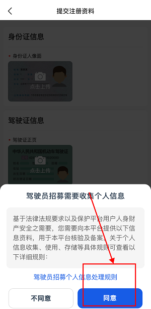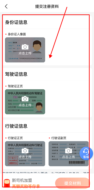 3、输入身份证、驾驶证和行驶证等信息,点击“提交材料”,审核通过就可以加入赚钱了。