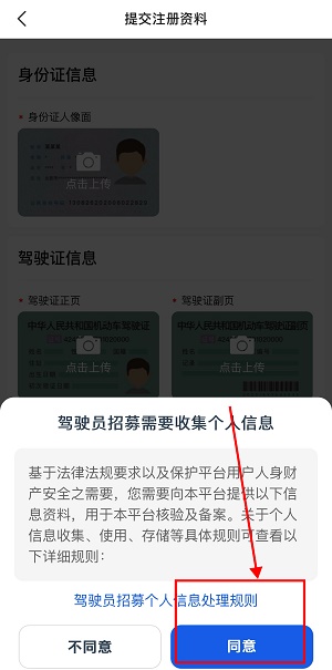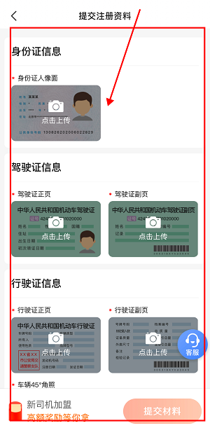 3、输入身份证、驾驶证等信息点击“提交材料”,审核通过就可以加入赚钱了。
