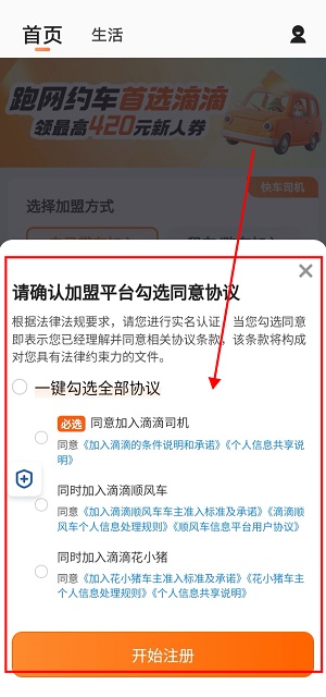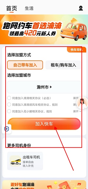 1、打开滴滴顺风车车主app,选择加入方式点击“加入快车”。