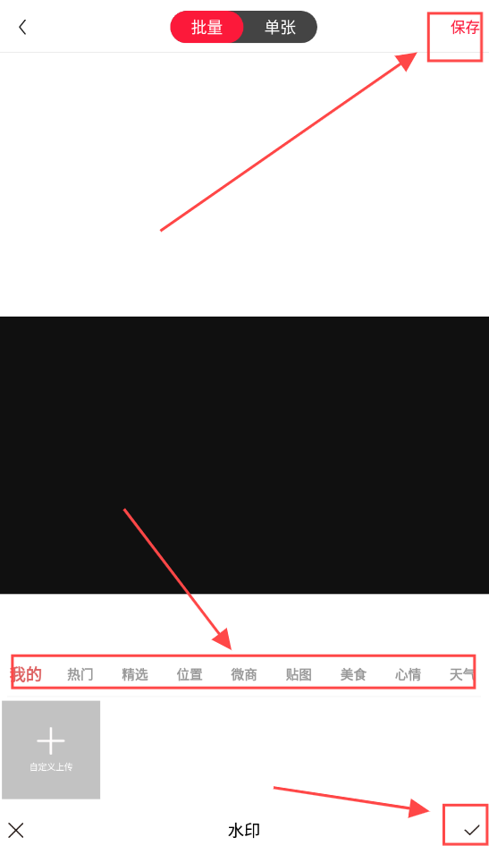 3、有各种水印,点击一个水印后点击右下角勾号,再点击右上角保存就可以了。