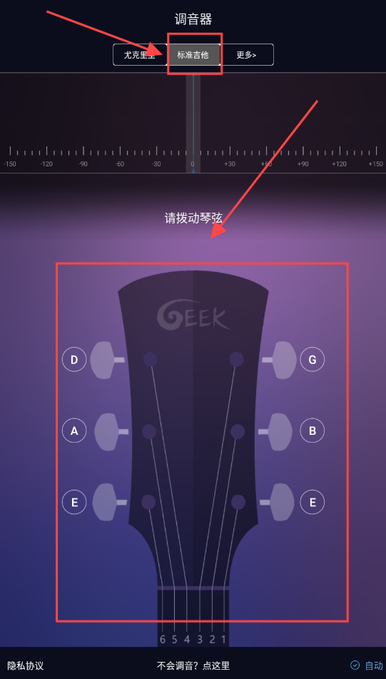 2、仔细观察屏幕上的动态指示标识,逐步调整琴弦张力直至指针稳定指向标准音高位置完成精确校准。