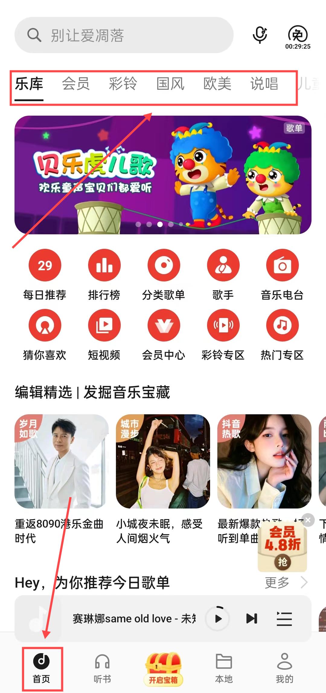 1、通过首页精心编排的推荐栏目可以快速浏览最新热门歌曲和精选歌单,轻点即可立即播放操作简单直观容易上手使用。