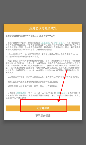 1、打开伙力专车app,点击“同意并继续”。
