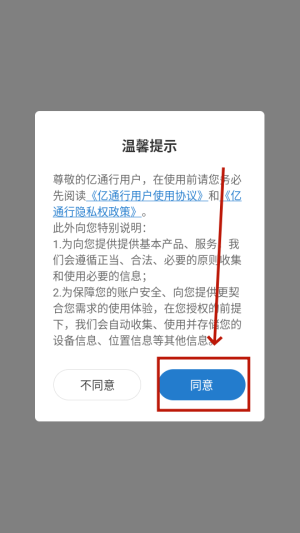 1、打开北京亿通行app,点击“同意”。