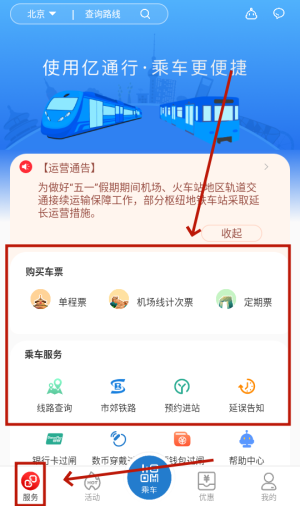 3、在服务页面中可以查看到购买车票、乘车服务等信息。