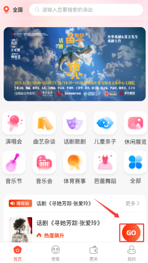 1、演出发现:浏览"近期热门"和"推荐演出",收藏感兴趣的活动。