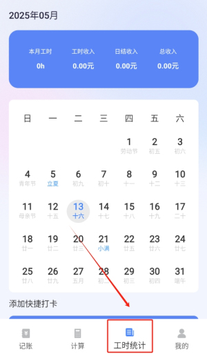 3、点击下方“工时统计”帮你记录工作打卡情况。
