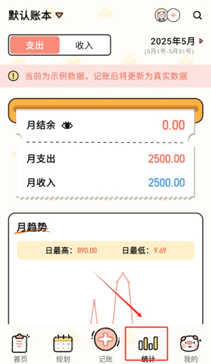 4、直观的消费趋势分析,用户可以通过图表查看自己的每日及月度消费变化,帮助其制定合理的消费计划,实现科学理财。