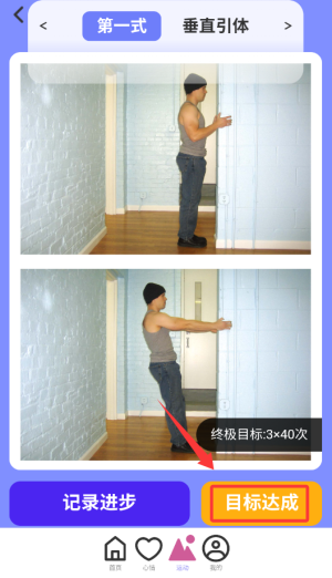 3、跟随视频教学完成动作练习,点击"目标达成"记录训练成果。