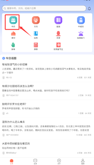 1、启动应用后,在首页导航栏选择"中药"功能进入知识库页面。