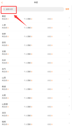 2、通过搜索框输入药材名称或功效关键词查找目标内容。