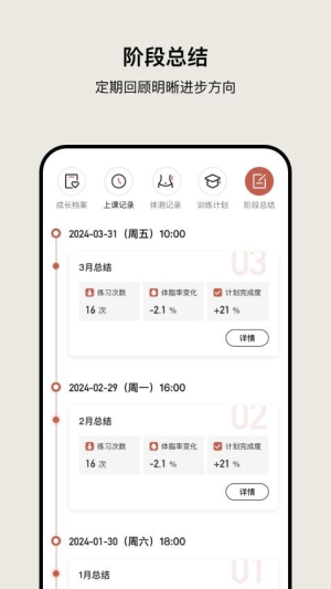 2、成长追踪:详细记录会员体测数据与课程表现,生成可视化成长报告。