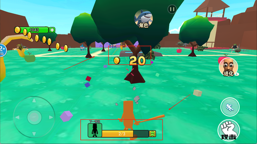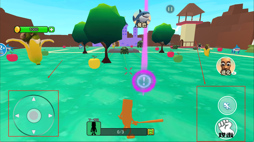 2、左侧控制角色移动方向,右侧为互动与攻击按钮,界面显示当前能量值与等级状态便于掌握进度。
