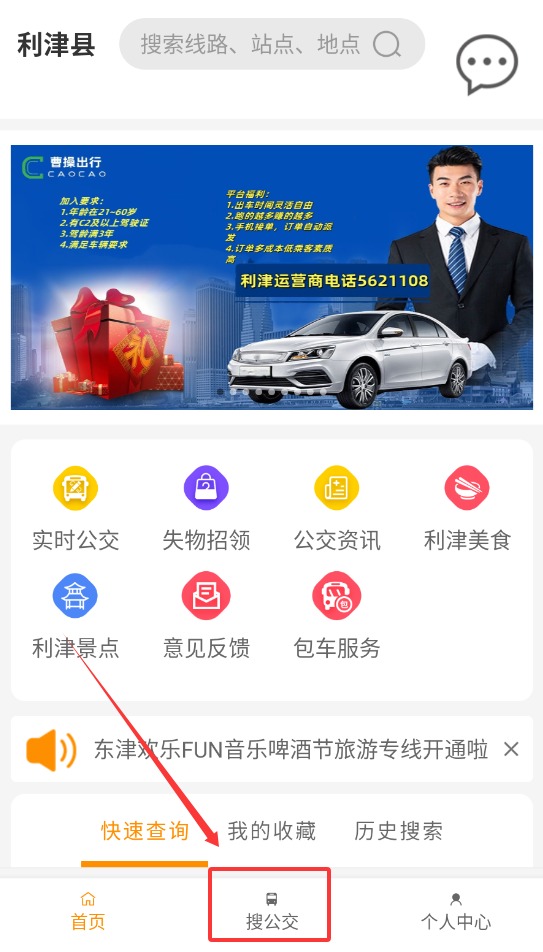 1、打开利津智慧公交app,在首页旁边有搜公交,点击进入。