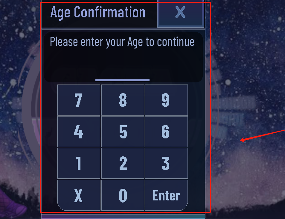 2、这是年龄确认窗口,要先输入年龄才能进游戏。用下方数字键盘输数字,输完点Enter就行,不想玩就点右上角X。
