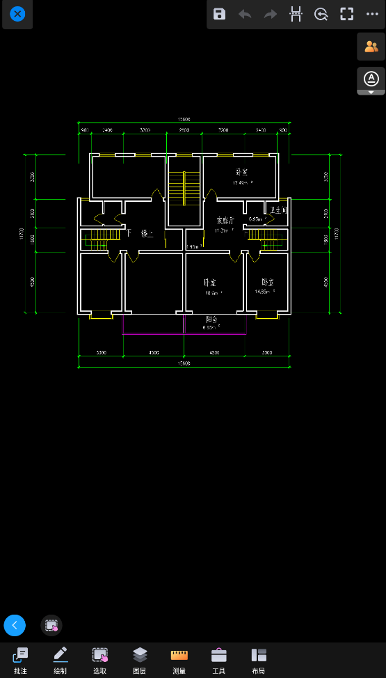 3、图纸打开后支持缩放查看细节,同时提供基础绘图工具供用户进行简单编辑修改。
