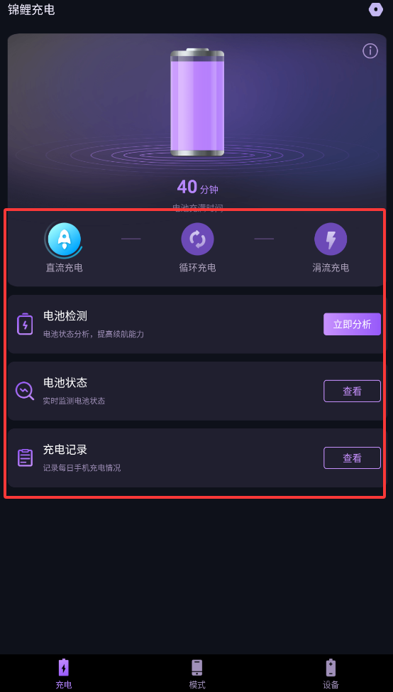 1、启动锦鲤充电APP后,首页清晰展示充电控制、模式切换等核心功能入口,方便快速操作。