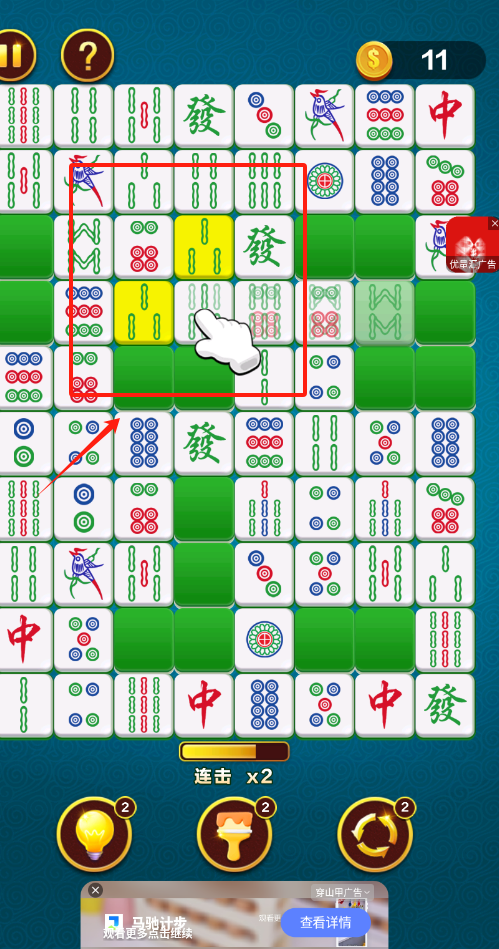3、点击红框选中的麻将牌进行消除,利用道具获得更多分数,注意连击倍数加成。