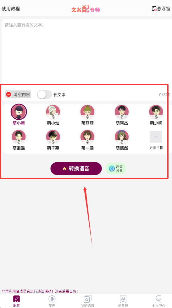 文案配音师能帮你把文字变成真人一样的语音,各种主播音色随便挑,大叔,萝莉,御姐都能选。还能玩变声搞怪,和朋友聊天特别有意思。操作特简单,写好文案一键生成配音,短视频,广告旁白,课件讲解都能用。