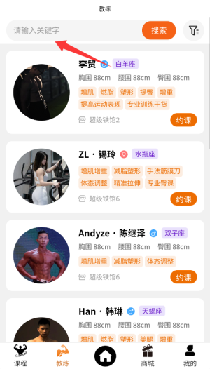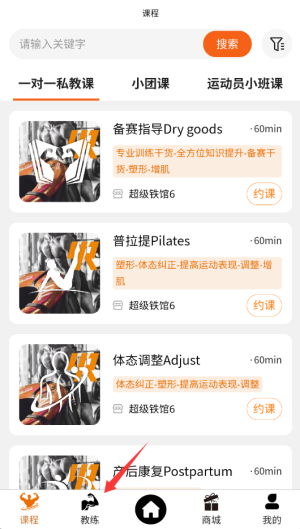 1、启动银锐健身APP后,在首页选择"教练"板块,浏览专业教练资料和课程信息。