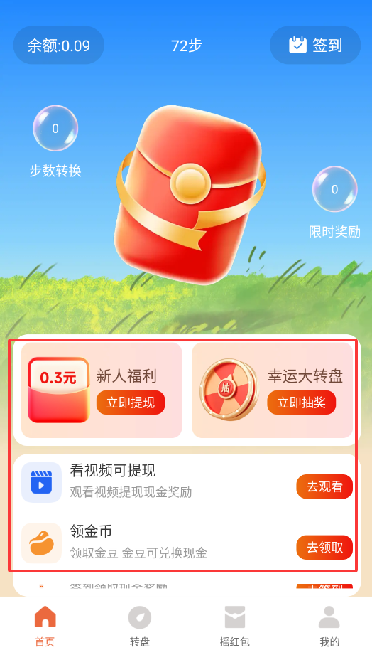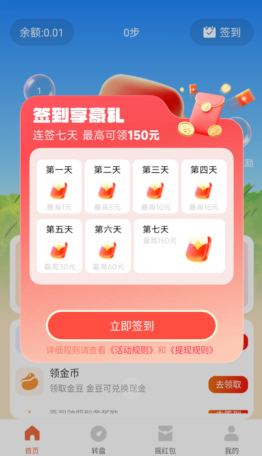 1、启动走路赚钱多APP后,在首页点击"签到"按钮即可领取每日步数奖励。
