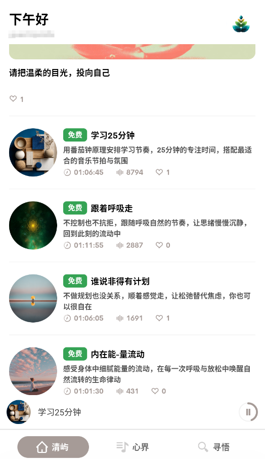 4、个性化定制:支持创建专属音频组合,可混合自然音、引导语、背景乐等元素。保存常用配方方便随时调用。