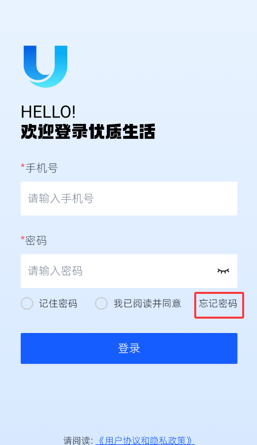 1、启动优质生活商户端APP后,在登录页面点击"忘记密码"选项进入重置流程。