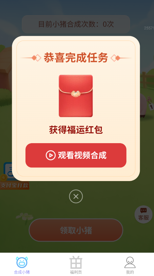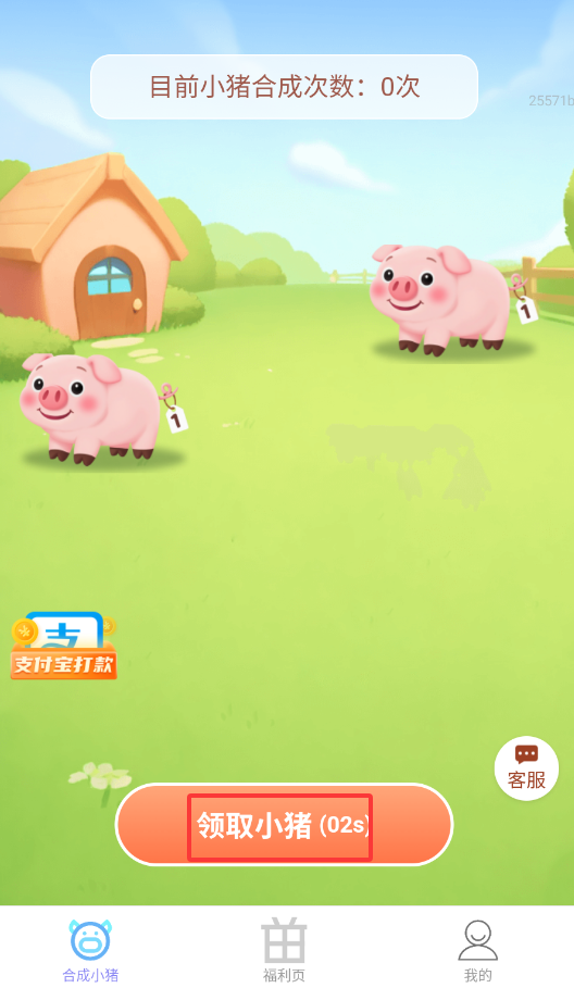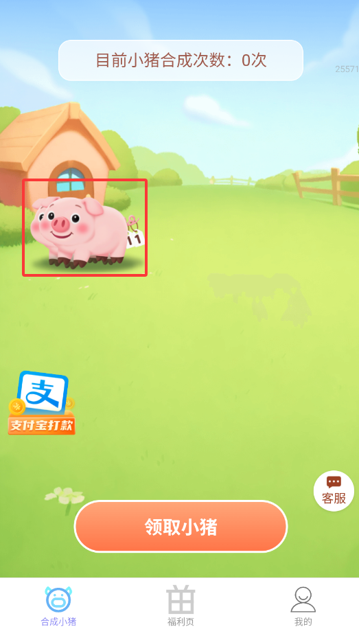 1、启动福星赚钱宝APP后,在"合成小猪"游戏界面点击"领取"按钮获取初始小猪。