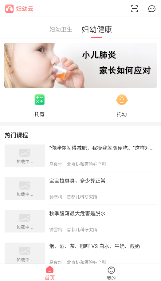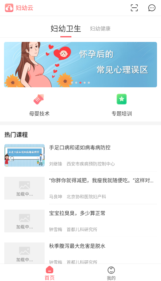 1、启动妇幼云APP后,首页"妇幼卫生"板块展示孕产护理、儿童保健等专业课程列表。
