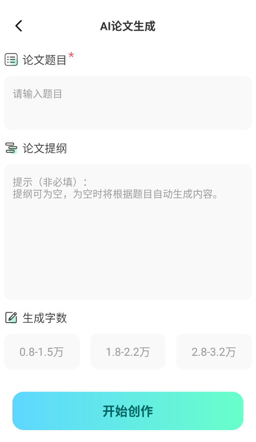 2、在AI辅助写作页面,输入论文的标题及大纲所需字数,系统即开始自动生成内容。