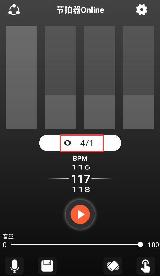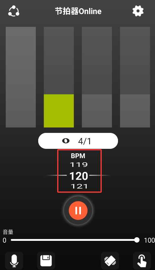 1、启动节拍器Online APP后,在首页通过滑动条或数字输入调整BPM(每分钟节拍数)数值。