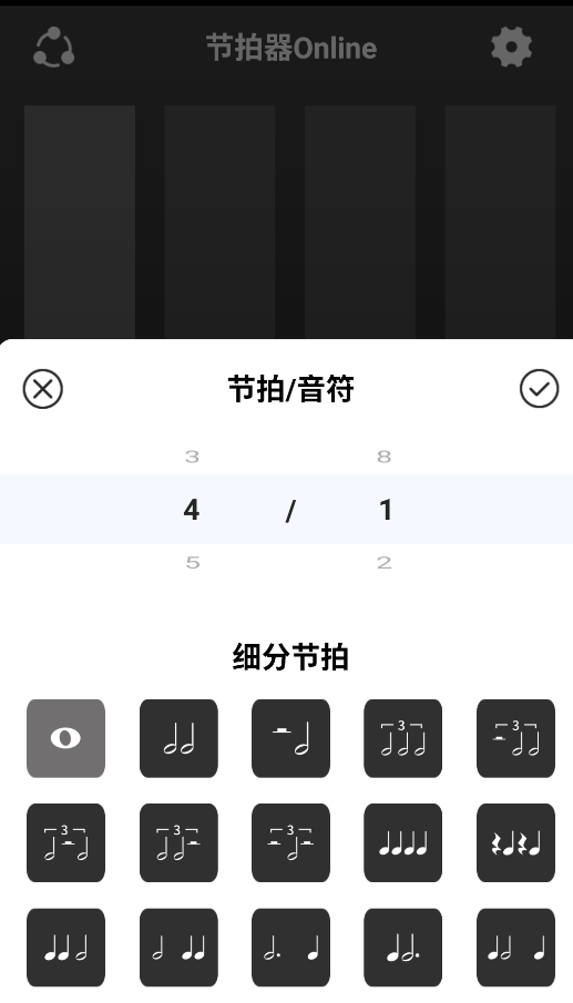 2、点击节拍模式按钮可选择等不同拍号组合。