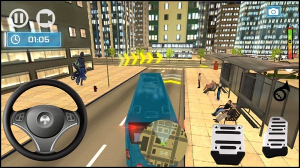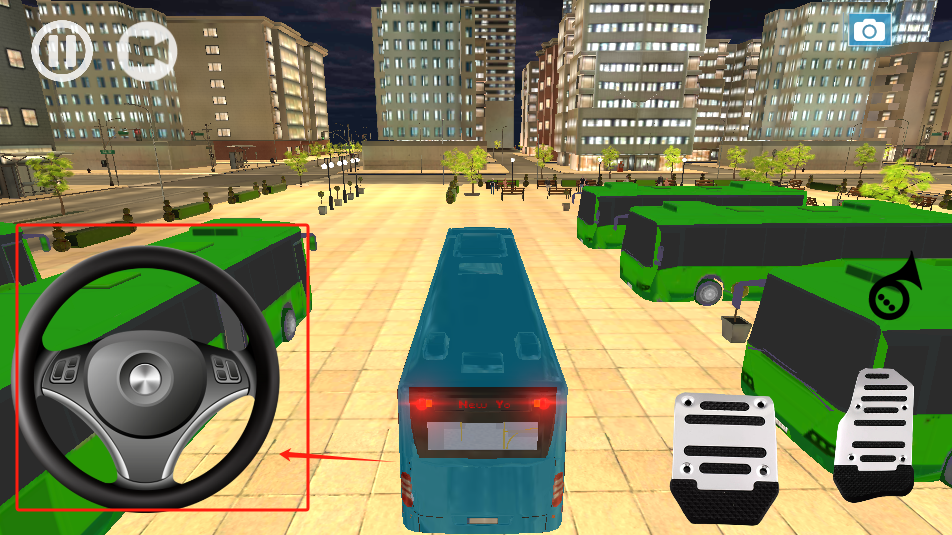 2、用方向盘和踏板开蓝色公交车,注意避开其他绿色公交车。