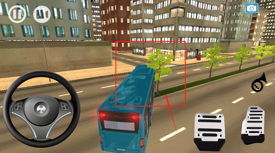 3、控制红框里的蓝色公交车,按喇叭图标可以提醒行人。