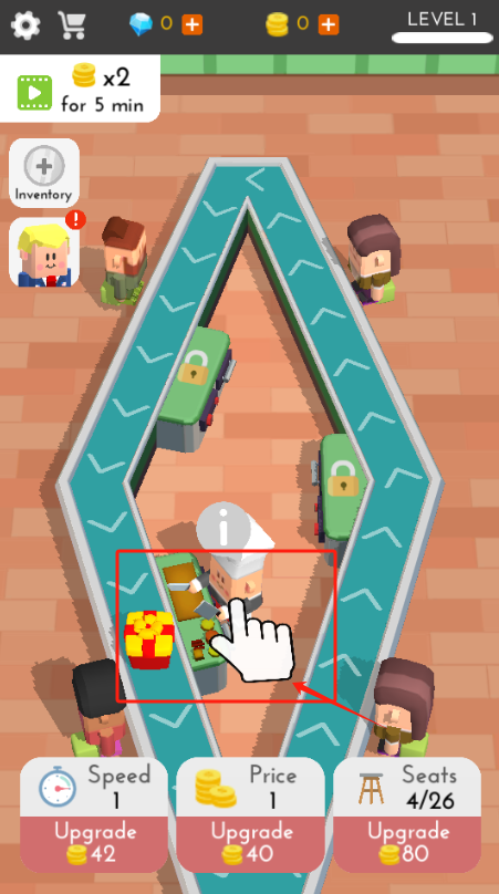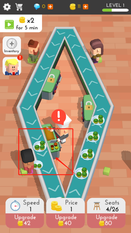 1、点升级按钮花金币提升速度,价格或座位数,厨师在做菜,传送带在送餐。