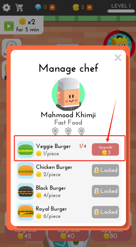 2、点管理厨师界面,可以升级蔬菜汉堡,其他汉堡还锁着不能买。