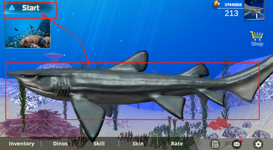 2、点左上角的Start开始游戏,右上角显示分数213和金币1,底部有商店等按钮。