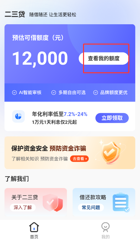 1、启动二三贷APP后,点击首页"查看额度"按钮进入申请页面。