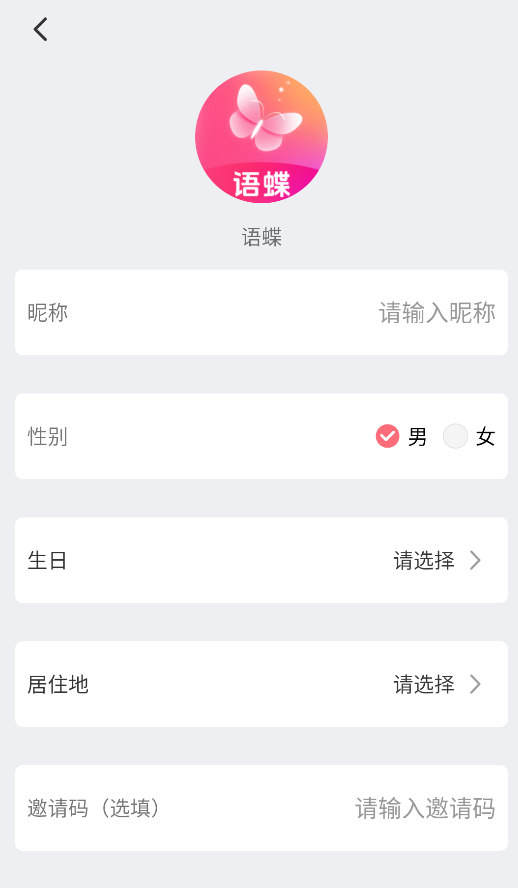 1、启动语蝶APP后,完成账号登录并完善个人资料(包括头像、简介等展示信息)。