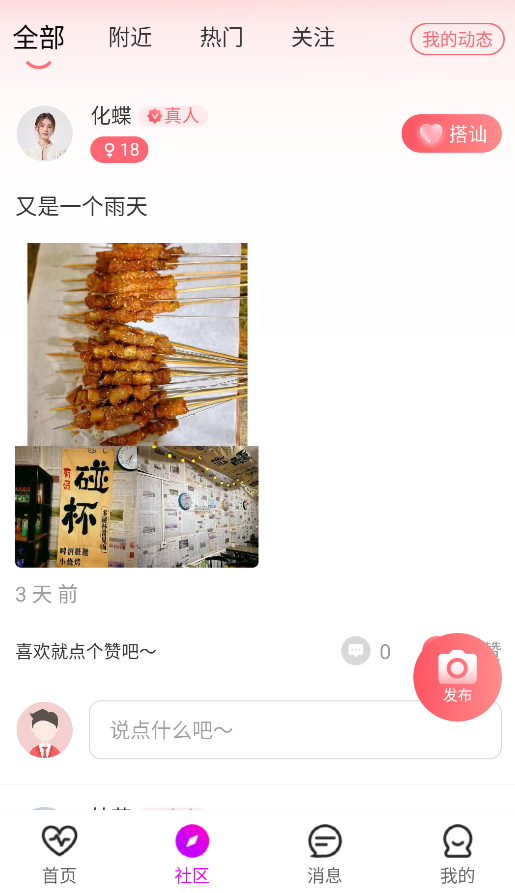 3、进入"社区"板块可发布图文动态,或浏览其他用户分享的生活趣事。