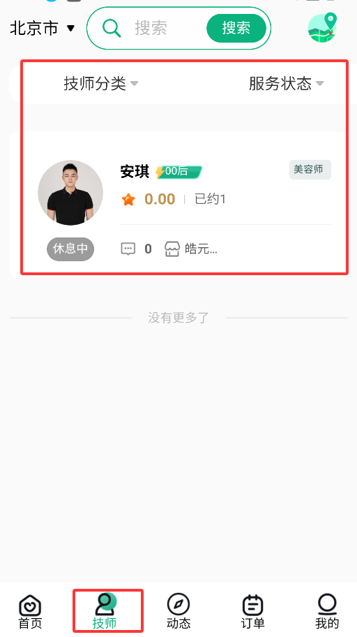 2、进入"技师"页面,可浏览所有可用技师信息,包括评分、服务项目等详细资料。