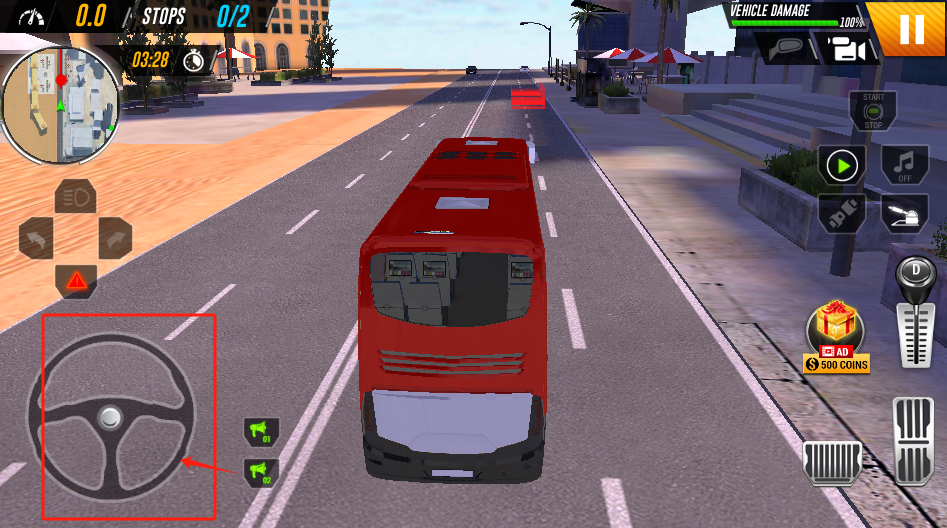 2、红色大巴在路上行驶,用左下角方向盘控制方向,注意上方站点进度和车辆状态。