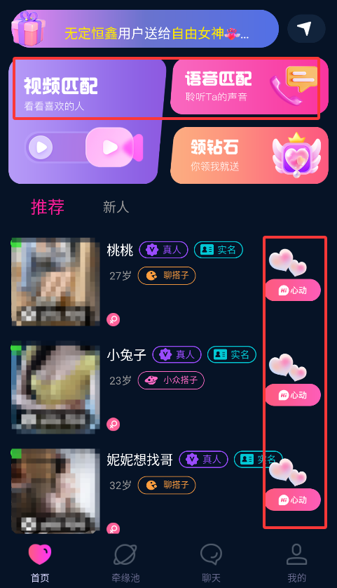 1、启动APP后,在首页选择"视频速配"或"语音匹配"功能,系统会实时推荐潜在聊天对象。