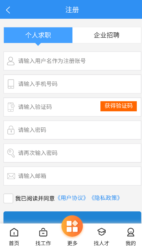 2、根据身份选择"求职者"或"企业HR"注册通道,填写对应的基本信息完成注册。
